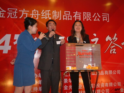 (景華紙業(yè)網獨家報道 記者何玲)元月6日,北京金冠方舟紙制品有限公司在北京金域萬豪酒店召開2004年新春客戶答謝會,公司總經理朱勇先生出席大會向各位新老客戶恭祝新春快樂并作了精彩發(fā)言。此次答謝會由金冠方舟紙制品有限公司主辦,景華紙業(yè)網協(xié)辦,支持單位為:金光紙業(yè)集團、大宇制紙、泉林集團和金華盛紙業(yè)。全國各地的客戶、經銷商等眾多嘉賓參加了答謝會。