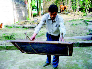 王萬華向記者出示他珍藏的古法造紙工具:簾子和輥子,并帶記者去看已經(jīng)破敗不堪的碾盤。那簾子和輥子已開始腐朽,而那巨大的石碾盤,因為荒廢,幾乎被萋萋荒草淹沒,讓人頓生懷古傷情。