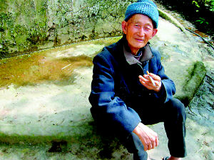 冉廣明老人經(jīng)常坐在古法造紙的大型工具———破敗的碾 盤上,回憶過去的歲月