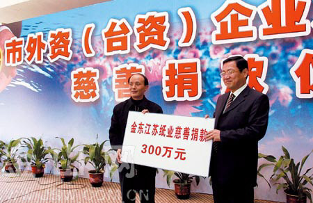 (中國紙網訊)3月18日下午,鎮江市慈善總會捐贈儀式在碧榆園隆重舉行。管理部游明毫經理代表金東紙業向市慈善總會捐款300萬元,這也是迄今為止鎮江社會各界向慈善總會捐贈的最大一筆善款。
