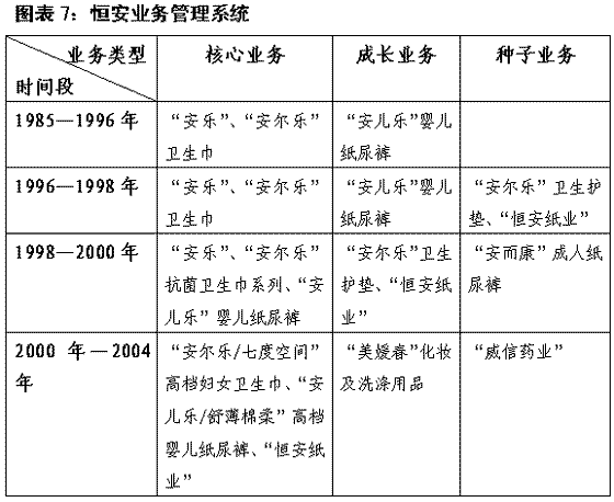 非常能說明恒安集團競爭戰(zhàn)略“穩(wěn)”之道的是其為締造“中國頂級家庭生活用品制造商”所精心安排的相關多元化產(chǎn)業(yè)發(fā)展戰(zhàn)略業(yè)務管理系統(tǒng)上,它奠定了“百年恒安”可持續(xù)發(fā)展的制度化基礎。(見圖表7)