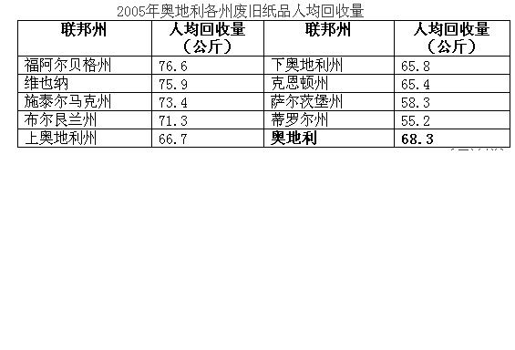 在歐盟國(guó)家的排比中,奧地利廢舊紙品的回收再利用成績(jī)也名列前矛。奧地利、德國(guó)和荷蘭廢舊紙品回收再利用量最大。在新入盟的國(guó)家當(dāng)中波蘭大有后來居上的勢(shì)頭。
