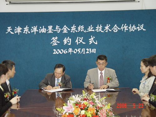 2006年5月23日,借天津"2006金東感恩之旅"順利召開之余,金東紙業黃良典副總經理、營業部黃秋雄經理、客服處戴萱副處長等一行四人親臨著名的油墨生產廠商天津東洋油墨有限公司,雙方的技術合作協議簽訂儀式將在此正式舉行。