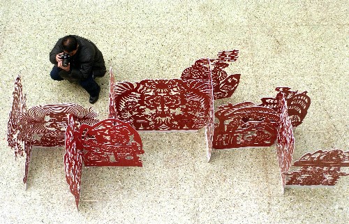 12月22日,一位攝影愛好者在拍郭梅花的剪紙作品。當日,郭梅花剪紙藝術精品展在太原山西省文聯(lián)大廈展廳舉行。郭梅花從小就喜歡畫畫、剪紙,是山西著名的民間剪紙藝術家。 新華社記者江宏景攝