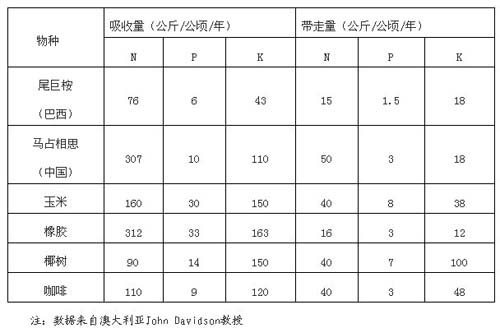 桉樹與其它作物吸收和帶走的礦質營養量比較