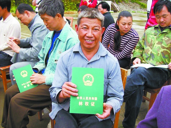 5月5日,龍勝各族自治縣江底鄉(xiāng)地靈村群眾高興地展示新領(lǐng)到的林權(quán)證書。當(dāng)日,該縣在地靈村舉行林權(quán)證書首發(fā)儀式,共有50多戶農(nóng)戶成為該縣第一批領(lǐng)到林權(quán)證書的對象。自林權(quán)制度改革工作開展以來,當(dāng)?shù)馗骷夵h政高度重視,采取干部包村到點的責(zé)任制,廣大林權(quán)工作人員不完成任務(wù)不出村。目前當(dāng)?shù)剞r(nóng)戶所有山場勘界、繪圖任務(wù)已順利完成,這里的群眾將在近期陸續(xù)領(lǐng)到具有產(chǎn)權(quán)意義的林權(quán)證書。□通訊員粟成會譚宗革攝