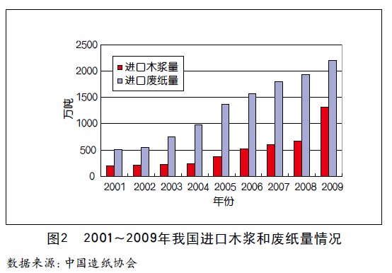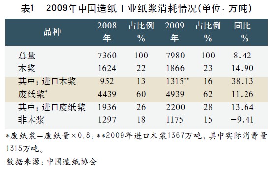 從2001年開始,我國造紙工業每年的紙漿消費量便呈現逐年遞增的趨勢。以此來支撐不斷擴張的造紙產能。據中國造紙協會調查資料,2009年全國紙漿消耗總量7980萬噸,較上年7360萬噸增長8.42%。