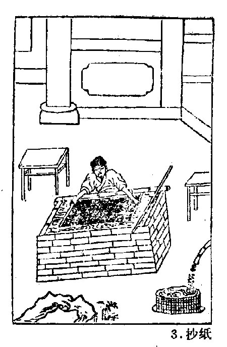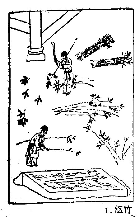 明朝時候有個科學家叫宋應星,他寫了一部《天工開物》,里面就講到造竹紙的方法:先把竹子截斷,剖成竹片,拌了石灰浸在水塘里,再取出來煮爛,制成紙漿,然后用繃在木架上的竹簾子從紙漿面上蕩過去。這樣,竹簾上就留下一層纖維,把這層纖維揭下來烘干,紙就制成了。當時用石灰等蒸煮紙漿,實際上就是化學處理法。這以經是一套相當完整的造紙方法了。