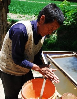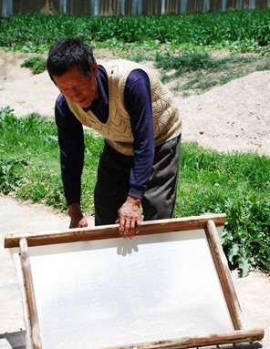 今年61歲的次仁多杰從15歲開始學習手工制作藏紙,并堅持至今。他告訴記者,藏紙的制作有六道工序:用刀子將狼毒草根部去皮去芯;取中間白色纖維組織搗爛熬煮;撈出后用石頭搗制成漿;然后倒入水中攪拌均勻;之后將紙漿澆入紗布框內;最后曬干成型。為了提高藏紙的亮度和柔韌性,煮制過程中要加入堿。澆漿則完全憑工匠的經驗和手感,以保證紙張的厚薄均勻,所以這也是藏紙制作中關鍵的一步。