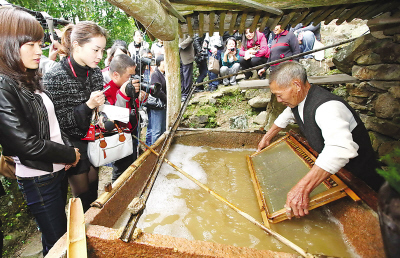 游客在湖嶺鎮東元村觀看83歲的村民尹日錫撈紙