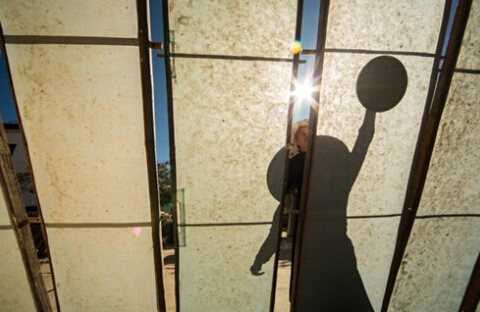 在陽光下晾曬在紙模上的傣紙,干燥后需用口面平滑的工具進行壓平拋光