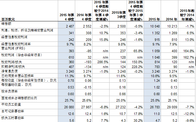 · 經營活動產生的現金流保持強勁,2015年總計為15.56億歐元(2014年:11.39億歐元);投資活動產生的現金流為5.99億歐元(2014年:2.55億歐元)。