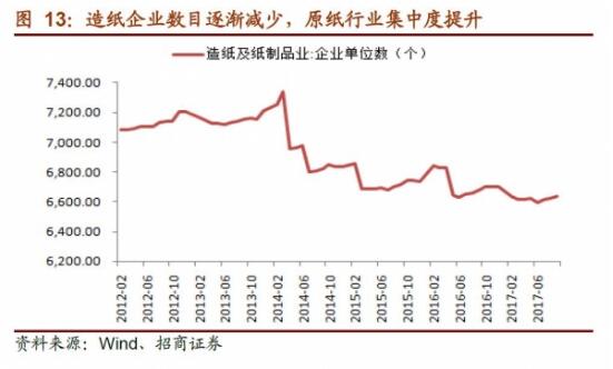 2016年下半年以來,隨著環(huán)保政策的趨嚴(yán)和供給側(cè)改革,原紙行業(yè)發(fā)生變革,小紙廠大量退出,同時箱板瓦楞紙價格高起,助力瓦楞紙包裝行業(yè)集中度提升。 (1)隨著小紙廠的退出,依賴小原紙廠供貨的小包裝廠失去廉價原材料渠道,而采購量大、信譽(yù)較好的大紙箱廠獲得一定的價格優(yōu)勢,成本優(yōu)勢從小紙箱廠倒臵到大紙箱廠手中。 (2)在箱板瓦楞原紙短缺的背景下,包裝企業(yè)的下游客戶越來越重視自身包裝供應(yīng)鏈的安全,對于供貨穩(wěn)定的大型包裝企業(yè)的依賴加深。 (3)生產(chǎn)工藝相對落后的包裝企業(yè)面臨環(huán)保壓力,導(dǎo)致小型包裝廠面臨退出風(fēng)險。 原紙行業(yè)集中度提升,小包裝廠價格優(yōu)勢消除 2016年以來,隨著環(huán)保政策趨嚴(yán)和供給側(cè)改革,箱板瓦楞原紙行業(yè)大量不符合標(biāo)準(zhǔn)的小企業(yè)退出截至2016年9月底,制漿造紙及紙制品業(yè)企業(yè)數(shù)量6636家,其中:紙漿制造業(yè)52家,造紙業(yè)2730家。2017年6月30日造紙行業(yè)排污許可證制度正式實(shí)施,截止7月8日,全國共發(fā)放造紙行業(yè)“排污許可證”2618張,較行業(yè)總企業(yè)數(shù)少164家,排污許可證制度對于行業(yè)小企業(yè)的生產(chǎn)限制作用明顯。
