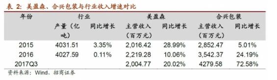 從整個行業(yè)來看,龍頭企業(yè)的增長明顯高于整個行業(yè)的平均水平。2015年、2016以產(chǎn)量衡量,行業(yè)的增長速度為3.35%和0.11%,而同期美盈森的營收增長為28.99%和10.06%,合興包裝的營收增長為5.01%和24.19%。2017年前三季度美盈森和合興更是分別實(shí)現(xiàn)了20%和73%的收入增長,龍頭企業(yè)憑借競爭優(yōu)勢收入增速持續(xù)跑贏全行業(yè)。
