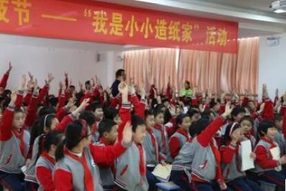 3月30日,在日照市東港區濤雒鎮棧子小學第三屆主題為“綠色科技,放飛夢想”的綠色科技節接近尾聲時,亞太森博(山東)漿紙有限公司志愿者來到該校,為四、五年級的學生上了一堂趣味橫生的“我是小小造紙家”科技實踐課。 志愿者們在多功能報告廳為孩子們上了一堂生動的理論課。現場氛圍十分活躍,有獎問答的活動形式極大地提高了學生的求知興趣。