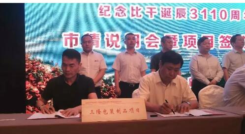 2018年5月17日,河南省衛(wèi)輝市委、市政府在開(kāi)元名都大酒店舉行市情說(shuō)明會(huì)暨工業(yè)項(xiàng)目簽約儀式。三隆包裝公司董事長(zhǎng)謝紅衛(wèi)與政府代表簽署合作協(xié)議,正式進(jìn)軍河南。