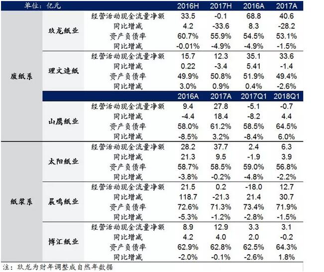 數(shù)據(jù)來源:中國固廢化學(xué)品管理網(wǎng),東吳證券研究所 就本輪漲價(jià)來看,我們堅(jiān)持美廢新政vs.含雜率不超過0.5%并無差異,均將通過廢紙?jiān)系募s束提升行業(yè)標(biāo)準(zhǔn),同時(shí)加速行業(yè)洗牌,而最終的受益者將為原料資源獲取能力較好兼具資金實(shí)力的龍頭企業(yè)。從目前造紙龍頭在國內(nèi)外布局、原料資源獲取、資金實(shí)力比較來看:我們認(rèn)為玖龍紙業(yè)、理文造紙、太陽紙業(yè)在海內(nèi)外布局方面持續(xù)領(lǐng)跑;玖龍紙業(yè)、理文造紙、山鷹紙業(yè)的廢紙?jiān)腺Y源獲取能力較強(qiáng);而玖龍紙業(yè)、理文造紙、太陽紙業(yè)則在資金實(shí)力上具有較強(qiáng)優(yōu)勢 圖表4:龍頭紙企的現(xiàn)金流和資產(chǎn)負(fù)債率(單位:億元)