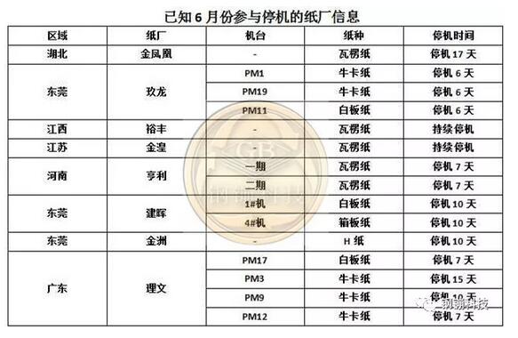 一、停機紙廠仍在增加,包裝紙機停產下半年可能很常見 據鋼镚科技統計,近日又有湖北金鳳凰紙業、江蘇金湟紙業、江西裕豐紙業發布6月停機計劃,其中湖北金鳳凰的瓦楞紙機將停產17天之久。通過對6月停機的生產線進行分析,小編發現此次停機首先是集中在以生產A級掛面箱板紙、白面/輕涂箱板紙以及灰底白板紙為主的生產線,隨后瓦楞紙生產線也受到影響。