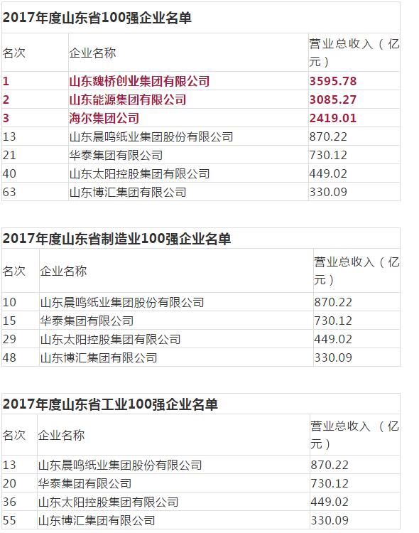 晨鳴 華泰 太陽 博匯入選山東省企業(yè)100強