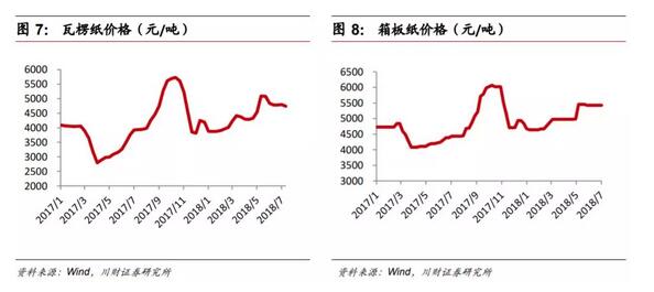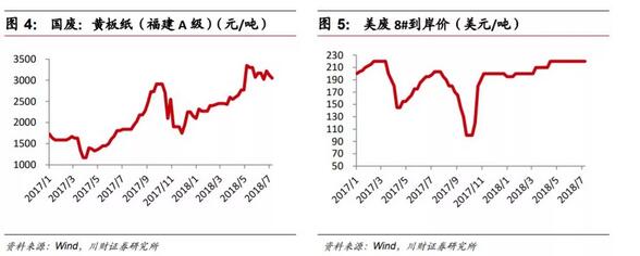 二、人民幣貶值,利好漿價 近期人民幣大幅貶值態(tài)勢延續(xù)(美元兌美元即期匯率由年初的6.51升至6.83、人民幣累計貶值幅度達(dá)4.92%),對造紙等原料進(jìn)口型企業(yè)形成壓力的同時有效支撐內(nèi)盤木漿價格上行。 8月3日我國國務(wù)院再公布第二輪對美加征的關(guān)稅反制清單,涉及范圍涵蓋進(jìn)口木漿的所有種類(其中化學(xué)針葉漿、化學(xué)闊葉漿均加征關(guān)稅5%),推升我國進(jìn)口紙漿的成本約為5%。預(yù)期后續(xù)我國內(nèi)盤漿價仍有上漲空間。 三、東莞玖龍、建暉再領(lǐng)漲廢紙收購價 在供給側(cè)改革的驅(qū)動下,環(huán)保政策趨嚴(yán)、外廢配額嚴(yán)格限制、檢查形勢趨嚴(yán)等多重因素疊加下,廢紙供需失衡導(dǎo)致國廢價格上漲,從而推動下游成品紙價格的上漲。外廢自3月開始上漲,漲幅達(dá)20%-50%,國廢價格持續(xù)上漲,廢黃板紙和廢純報紙價創(chuàng)近兩年新高,年內(nèi)漲幅達(dá)40.6%和7.8%。
