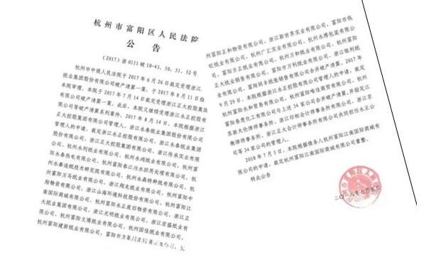 36家公司宣告破產 根據管理人查明的資產負債情況,永正控股及其關聯公司符合企業破產法破產清算的規定,富陽法院于2018年6月27日裁定宣告浙江永正控股有限公司、浙江永泰紙業集團股份有限公司、浙江正大控股集團有限公司、浙江傳承實業有限公司、杭州永利紙業有限公司、杭州永鴻紙業有限公司、杭州富陽永泰熱電有限公司、杭州富陽春江污水回用處理有限公司、杭州永泰造紙技術研究院有限公司、杭州永森特種紙有限公司、杭州富陽萬馬紙業有限公司、浙江翔龍紙業有限公司、杭州富陽中翔物資有限公司、浙江山海環境科技股份有限公司、杭州富陽永正廢舊物資有限公司、浙江正大紙業集團有限公司、浙江光明紙業有限公司、浙江宏盛紙業有限公司、杭州富陽文博紙業有限公司、杭州國佳紙業有限公司、杭州富陽建新紙業有限公司、富陽市方新廢紙購銷有限公司、杭州富陽正和物資有限公司、浙江新世界實業有限公司、富陽市錢旺紙業有限公司、杭州廣匯實業有限公司、杭州永博包裝有限公司、富陽方正紙業有限公司、杭州萬和紙業有限公司、杭州富陽正大紙業銷售有限公司、富陽市萬利紙業有限公司、浙江銀利紙業有限公司、富陽同豐紙張銷售有限公司、杭州富陽永和貿易有限公司、杭州富陽唯佳商貿有限公司、杭州富陽春意化工有限公司等36家公司破產,并予以公告(見7月9日富陽日報第5版)。