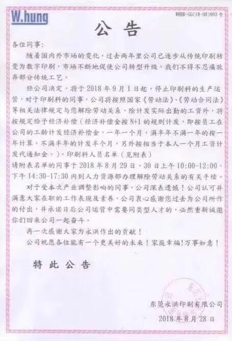 9月1日停止印刷科的生產(chǎn)運(yùn)營,所有同事將解除勞動關(guān)系 ”自2018年9月1日起,東莞永洪印刷有限公司將停止印刷科的生產(chǎn)運(yùn)營,所有印刷科同事將解除勞動關(guān)系。”2018年8月28日,東莞永洪印刷有限公司向內(nèi)部發(fā)布了這份公告: