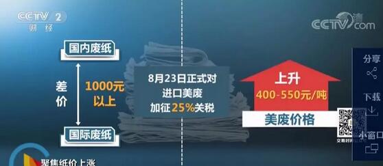 據了解,目前國內廢紙和國際廢紙每噸基本差價在1000元以上,8月23日對進口美廢加征25%關稅正式實施之后,分析人士預計美廢價格將上升400-550元/噸,或將推漲所有外廢價格,國內外廢紙價差進一步縮小。