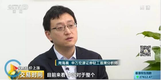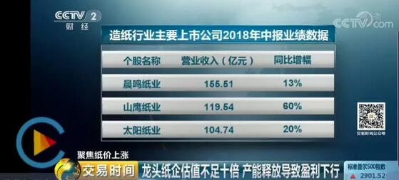 上海中華印刷有限公司采購供應部經理朱勇明:我們今年為了準備教材的紙,投入了很多資金,把正常的資金使用都搞得很緊張。紙張庫存壓力也很大,不買到時候又會漲,活來的時候這個紙價就承受不住。 記者了解到,每年上海市中小學教材的用紙量在一萬噸左右。目前,膠版紙的批發價已經漲到了每噸7250元,工廠擔心漲價提前囤貨800噸,為明年春季的教材做準備。而對于高白輕涂紙等一些特殊紙張,紙廠還設置了1000噸的起做標準,同時要求付清錢款才開始生產,交貨周期從一個禮拜延長到了一個月。 上海中華印刷有限公司采購供應部經理朱勇明:原先這種情況,我們在采購做了這么多年從來沒碰到,我們訂的教材紙也是要預先付錢,紙廠才會安排生產。有些要全額付掉,有些要付部分訂金。以前不用,以前是有一個付款周期的,訂貨,三個月以后付賬,現在是要先收到錢,然后才會安排生產。 龍頭紙企估值不足十倍,產能釋放導致盈利下行 造紙行業是非典型的周期性行業,行業景氣度與國家政策、市場供需密切相關。工信部數據顯示,2018年1-6月,全國造紙行業累計主營業務收入4285.1億元,同比增長12.5%;累計利潤總額272.4億元,同比增長16.6%。目前造紙行業上市公司2018年中報已經披露完畢,相關的個股的業績表現和估值情況如何呢? 目前,A股市場造紙板塊共有22家上市公司,總市值超過1500億元,市值排名前五的公司分別是太陽紙業、晨鳴紙業、山鷹紙業、仙鶴股份以及中順潔柔,市值均超過百億,在板塊總市值中占比超過50%,行業集中度較高。
