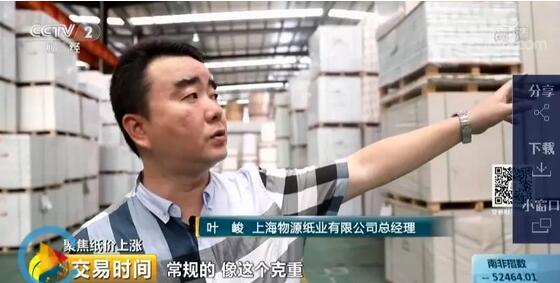 申萬宏源證券輕工首席分析師周海晨:目前來看,中國對于整個廢紙的依存度其實是比較高的,大概在40%左右。因為現在整個有政策預期,到2020年以后,可能廢紙會逐漸取消進口。我覺得對于整個國內的廢紙,仍然會有很強的價格支撐力。 需求回升推漲紙價,印刷廠需先打預付款 從需求來看,下游紙制品主要分為文化用紙、包裝用紙、生活用紙和特種紙這四類,其中文化用紙和包裝用紙的價格波動幅度相對較大。適逢“金九銀十”的傳統旺季,從八月中旬開始,成品紙市場訂單逐漸增多,下游提前備貨,紙廠相繼提漲成品紙價格。當前市場供貨情況如何?下游廠商的日子又過得怎么樣呢? 為了了解近期成品紙價的具體情況,記者來到位于上海市寶山區的一家紙品經銷商倉庫,倉庫門口一輛紅色的貨車正在裝貨,車上平裝和卷筒的銅版紙加起來有10噸左右。負責人告訴記者,最近一段時間倉庫的訂單量比較穩定,每天進貨量和出貨量都在100噸以上。