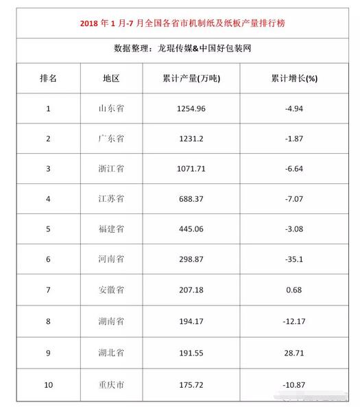 2018年第四季度已經(jīng)到來,有業(yè)內(nèi)人士認為,目前淘寶天貓雙十一活動規(guī)則正式公布,商家正進入統(tǒng)籌備貨的時候,旺季也將逐步開啟。那么,在進入旺季之前,目前的紙品包裝產(chǎn)業(yè)鏈的行情是怎樣的呢? 為此,筆者通過國家統(tǒng)計局查詢到了2018年1-7月份的全國機制紙及紙板產(chǎn)量,發(fā)現(xiàn)其產(chǎn)量為6923.3萬噸,變化幅度不大,同比下降0.9%。同時,筆者還查詢到了9月3日-4日,包括玖龍在內(nèi)的全國14家紙廠的報價情況,以供大家參考! 1-7月份,全國機制紙及紙板產(chǎn)量為6923.3萬噸,河南省同比下滑35.1% 國家統(tǒng)計局數(shù)據(jù)顯示,1-7月份,全國機制紙及紙板產(chǎn)量為6923.3萬噸,同比下降0.9%。前十省市分別是山東省、廣東省、浙江省、江蘇省、福建省、河南省、安徽省、湖南省、湖北省和重慶市。 其中,山東省、廣東省、浙江省三大省份1-7月份累計產(chǎn)量均達到了1000萬噸以上,分別為1254.96萬噸、1231.2萬噸、1071.71萬噸,明顯高于其余七家省市一個層級。