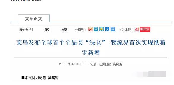 9月6日,菜鳥宣布,其打造的全球第一個全品類“綠倉”已經(jīng)在寧波投產(chǎn)。除了接收商品原包裝的紙箱外,該倉庫不再新增任何紙箱,而是使用循環(huán)次數(shù)可達10次以上的循環(huán)箱,目前已經(jīng)覆蓋倉內(nèi)數(shù)萬SKU(筆者注:每款商品都有一個SKU,便于淘寶識別商品)。 此外,菜鳥將啟動全新升級的“回箱計劃”,范圍將拓展到全國百城5000個回收點。淘寶、高德、支付寶、菜鳥裹裹將從2018“雙11”起全面支持該計劃的實施。
