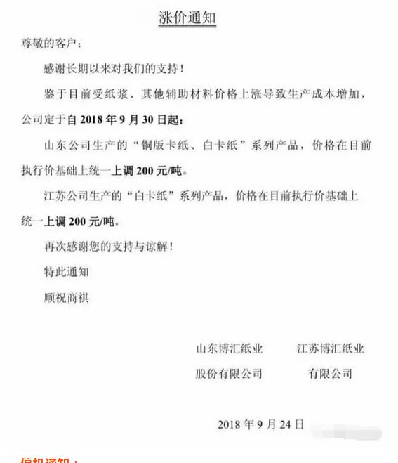 博匯紙業(yè):受原材料價(jià)格持續(xù)上漲影響,山東博匯紙業(yè)計(jì)劃自9月30日起,上調(diào)白卡紙及銅版卡紙200元/噸。受原材料價(jià)格持續(xù)上漲影響,江蘇博匯紙業(yè)計(jì)劃自9月30日起,上調(diào)白卡紙200元/噸。