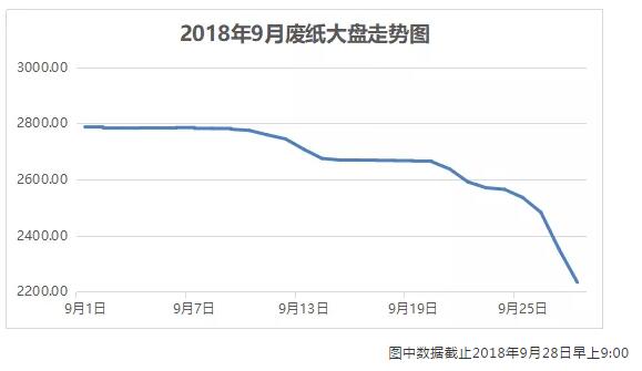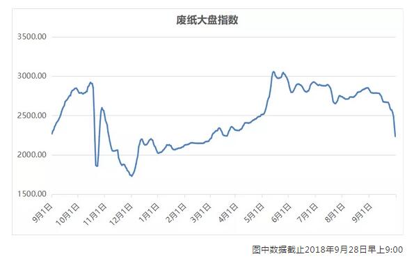 9日之間,黃板類(lèi)價(jià)格下跌650-800元/噸不等。單次下調(diào)價(jià)幅度更是從20日的30元/噸飆升至28日的300-350元/噸。 截至2018年9月28日早上9:00,廢紙價(jià)格指數(shù)跌至2233.87,并且還有繼續(xù)下跌的趨勢(shì)。 國(guó)慶過(guò)后廢紙價(jià)格還會(huì)反彈?
