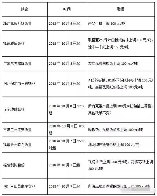 10月7日-9日,玖龍、聯(lián)盛領(lǐng)銜紙價(jià)上漲 10月初,原紙價(jià)格出現(xiàn)小規(guī)模的上漲:山鷹紙業(yè)提價(jià)200元/噸,浙江、福建等地部分紙廠跟進(jìn)上調(diào)。隨著國慶假期的結(jié)束,造紙廠陸續(xù)開工復(fù)產(chǎn),紙價(jià)喊漲之聲逐漸蔓延開來。 10月7日-9日,在此期間漲價(jià)的紙廠數(shù)量明顯增加,其中不乏大型紙廠,如泉州玖龍上調(diào)地龍牌白板紙100元/噸、福建聯(lián)盛上調(diào)藍(lán)葉、綠葉白板紙100元/噸。