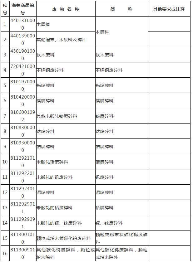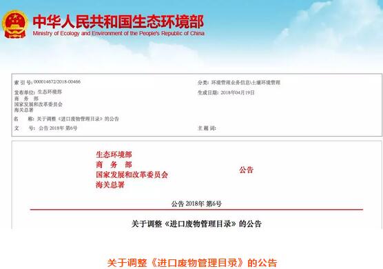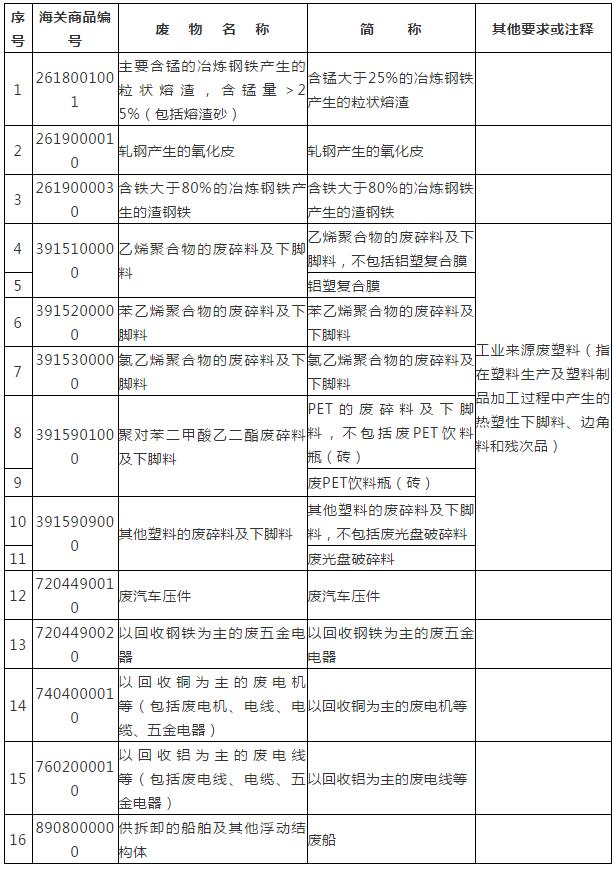 為進一步規范固體廢物進口管理,防治環境污染,根據《中華人民共和國固體廢物污染環境防治法》《固體廢物進口管理辦法》及有關法律法規,生態環境部、商務部、發展改革委、海關總署對現行的《限制進口類可用作原料的固體廢物目錄》《非限制進口類可用作原料的固體廢物目錄》和《禁止進口固體廢物目錄》進行以下調整: 一、將廢五金類、廢船、廢汽車壓件、冶煉渣、工業來源廢塑料等16個品種固體廢物(見附件1),從《限制進口類可用作原料的固體廢物目錄》調入《禁止進口固體廢物目錄》,自2018年12月31日起執行。 二、將不銹鋼廢碎料、鈦廢碎料、木廢碎料等16個品種固體廢物(見附件2),從《限制進口類可用作原料的固體廢物目錄》《非限制進口類可用作原料的固體廢物目錄》調入《禁止進口固體廢物目錄》,自2019年12月31日起執行。 《進口廢物管理目錄》(環境保護部、商務部、發展改革委、海關總署、質檢總局2017年第39號公告)所附目錄與本公告不一致的,以本公告為準。 特此公告。 附件:1.2018年年底調整為禁止進口的固體廢物目錄 2.2019年年底調整為禁止進口的固體廢物目錄 生態環境部 商務部 發展改革委 海關總署 2018年4月13日 附件1.>2018年年底調整為禁止進口的固體廢物目錄