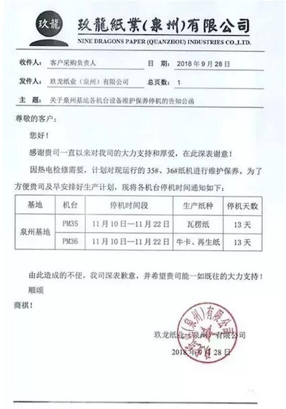 雙十一大戰即將打響! 數十億套個包裹,數十億的包裝 紙包裝業滿以為可以撒歡狂歡一把 然鵝! 狂歡?不存在的! 電商包裝的一枝獨秀無法掩蓋整體需求的低迷, 大半年積存的庫存壓力終究要釋放的。 于是乎, 一手“停機削供給”,一手“降價去庫存”的胡蘿卜加大棒政策出臺了 ▼▼▼ 吶! 💥中國包裝紙行業的龍頭老大及舵手💥 💥產能占據中國包裝紙產能四分之一強的紙業巨頭💥 ······· 玖龍紙業再一次宣布降價了! 絕對的風向標!!!