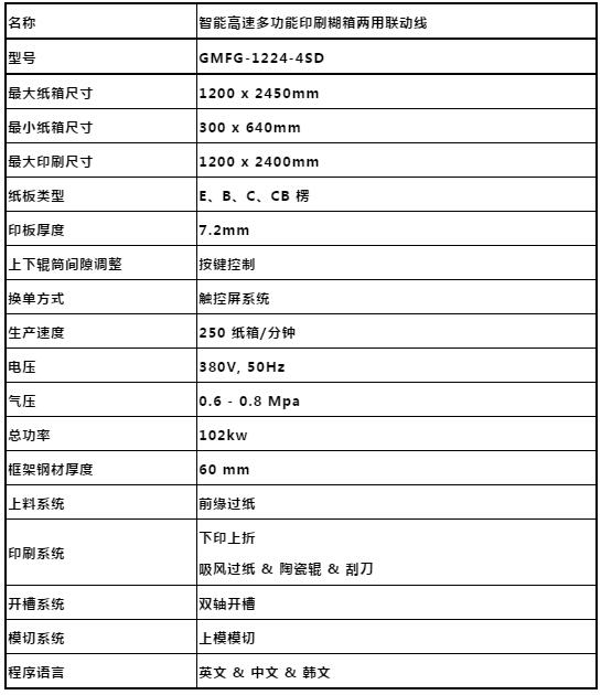 1、紙板線過來的紙板不用翻板直接到印刷機送紙部; 2、送紙部堆積的紙板表面進入送紙部,灰塵全部清除干凈; 3、印刷部下面印刷,無灰塵,水墨在下面方便管理,很干凈; 4、開槽刀從里面開始,開槽刀口很好看,無破紙,槽兩邊也是很干凈漂亮; 5、模切輥在上面,模切從里紙往外切,刀口表面很漂亮,廢紙全部掉干凈,不會帶到糊折合部卡紙; 6、大規(guī)格的紙箱更適合,有空間往上面折合,上印下折方式則下折空間太小,容易碰地面。 與其它公司聯(lián)動線的區(qū)別 國內(nèi)方式:印刷開槽上膠后直接到計數(shù)排出,缺點如下: 1、膠水沒徹底干; 2、沒有拍齊功能,紙箱成型不好,剪刀口、大小口嚴(yán)重; 3、三五層紙板生產(chǎn)速度不一樣。 佳研特方式(印刷開槽上膠折合后進入拍齊疊堆部),優(yōu)點如下: 1、有效校正剪刀口及成型; 2、疊堆和風(fēng)機:經(jīng)過疊堆時間延長出紙時間,膠水完全可以干; 3、三五層紙板生產(chǎn)速度一樣,有兩次時間緩沖功能。 此臺設(shè)備型號參數(shù)如下: