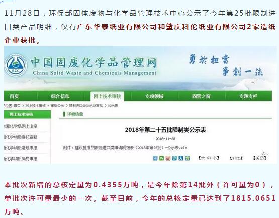 又到了年終收關階段,包裝紙行業經歷了一個混沌的逢8之年。在尾聲階段,受到包裝紙需求異常疲軟的影響,各大紙企紛紛采取了停機保價的策略,受此影響,國廢價格持續低迷,紙價易跌難漲。 鑒于今年進入原紙大增和實際需求萎縮的影響,造紙行業對進口外廢的需求興趣不大,1800萬噸的批文,實際上遠超預期,因此,今天環保部固體廢物與化學品管理技術中心公布的本年第25批外廢批文中,僅有一家企業獲得了4355噸。