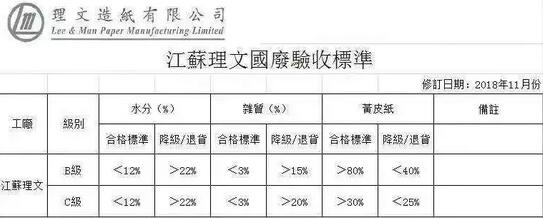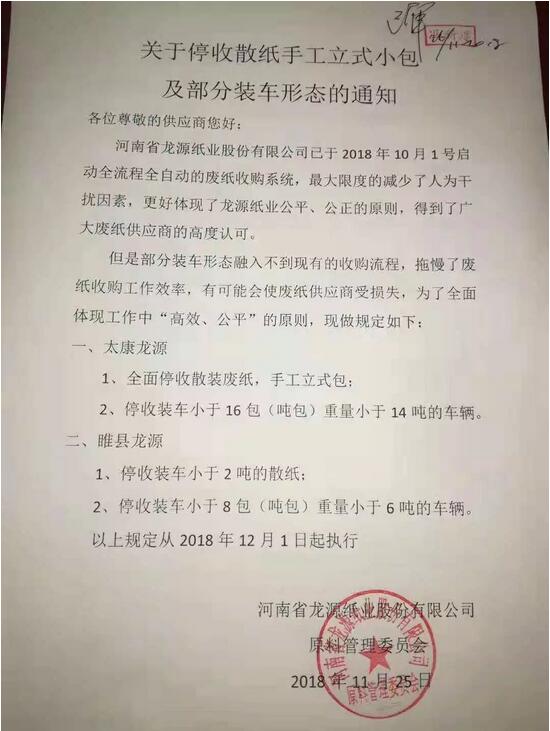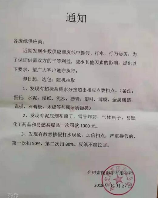 八、山東泰安泰和紙業 泰安泰和外地各位供應商:切記裝貨完畢后一定要求司機,在高速路口處拍攝錄像視頻,視頻內容要求(1.車號,2.車身所裝貨物,3.收費站名稱,4.司機本人。),最后必須同時提供300公里以外過路票!出據電腦打印磅單,必須錄像視頻,不能拍相片。不能在微信中錄制!(要求在手機自帶照相功能錄制)不按規定要求執行者,實行退貨處理!!! 九、山東棗莊豐源通達中科紙業 山東豐源通達中科廢紙送貨車輛規范:為了進一步提高工作效率,杜絕安全隱患,自2018年11月21日起,國廢供貨車輛運輸廢紙不能與其他物品混裝,上下層打包件廢紙需擺放整齊,寬度、高度要一致,不能縱橫向混合,違反以上規定,對供貨商罰款一百元,違章超過三次禁止進廠。注意加包物分揀。 十、山東德州平原匯勝紙業 敬告:各尊敬的供應商,目前在實際生產使用中發現廢紙中摻加纖維板、布條、線頭、木塊等非造紙類雜物較多,影響公司生產,現通知各位供應商嚴格分選打包,不得摻雜以上物品,以免影響整車廢紙檢驗扣點,從11月30日起執行,請各供應商嚴格執行。匯勝平原 十一、山東太陽宏河紙業 通知:因近期收貨發現有些供應商對打包質量要求不嚴格,故意夾雜大量垃圾,企圖蒙混過關,對于惡意造假,故意夾雜大量垃圾的貨加扣70%或者整車沒收,并強制卸貨,不在暫扣車輛,請各供應商嚴格執行,做好宣傳工作,控制好打包質量!太陽宏河紙業采購部原料檢驗部 十二、江蘇丹陽長豐紙業