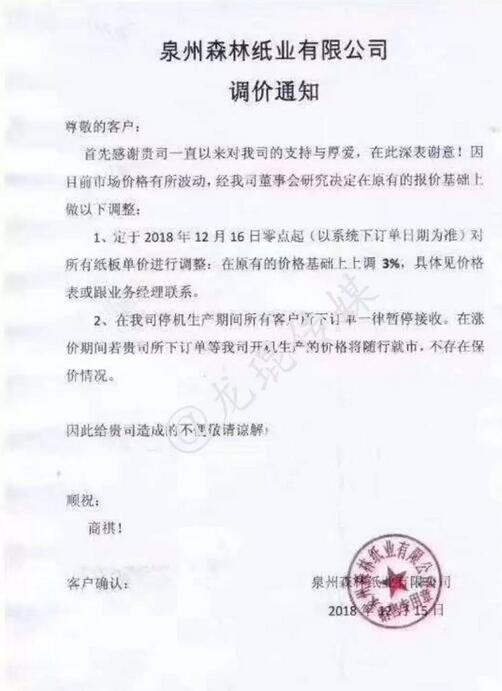 泉州森林紙業(yè)有限公司 自2018年12月16日零點起,在原價格的基礎(chǔ)上上調(diào)3%。