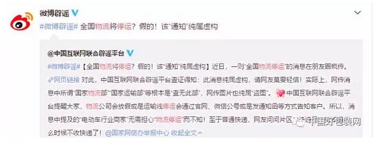 對此,中國互聯網聯合辟謠平臺向交通運輸部求證,此為謠言。實際上,所謂“國家物流部”、“國家運輸部”等根本是“查無此部”。 在國務院組織機構中,只有“交通運輸部”,而交通運輸部從來沒有發布過所謂的“物流停運通知”。