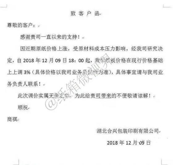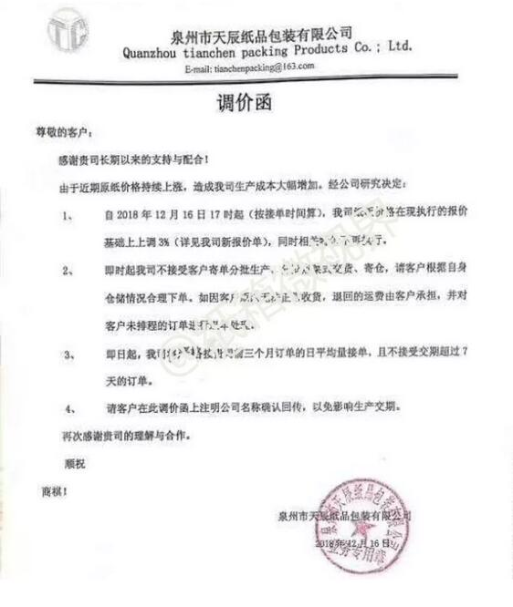 12月份因原紙暴漲,又有3家紙板廠發布漲價函,目前,紙板漲價函已增至21張,多漲3%,部分上漲100元/噸,另有部分漲1.7元/平方!77張原紙、紙板漲價函滿天飛,國廢上漲情緒下原紙、紙板漲價還將繼續,紙箱廠頂不住了!! 杭州三星紙業有限公司:12月21日起,灰板紙出廠價統一上漲100元/噸(未交付的訂單也在漲價范圍內)。到期貨款未付清一律停止發貨。 溫州鴻馬包裝有限公司:12月20日上午11:00起,所有預付款和月結客戶價格在11月5日標準價基礎上上漲。細瓦二層瓦楞紙板上調0.05元/平方,細瓦三層紙板上調0.05元/平方。 宿州龍發包裝有限公司:12月19日17:30接單起(以單到款到為準)所有紙板價格在原折扣上上調3個點。 據小編不完全統計,除以上新增的3家紙板廠的漲價函外,不到10天,已有18家紙板廠發布漲價通知。 換句話說,目前,紙板漲價函已增至21張。紙板多漲3%,部分上漲100元/噸,另有部分漲1.7元/平方!