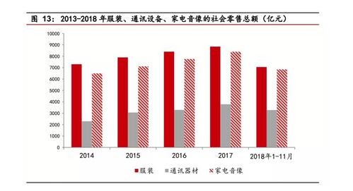 來源:川財證券研究所 供給端:2018年外廢進口審批頻次增加,全年總量下降,但是分布更合理,年底仍然有剩余配額,緩解了市場恐慌情緒。 我國外廢進口政策逐步收緊,2018年3月1日起,我國正式開始執行廢紙進口新規,進口廢紙含雜率需低于0.5%,因此供給端略有收縮。 2017年累計審批外廢進口2806.88萬噸,但是第一批占比高達93%,下半年開始幾乎沒有新增進口配額,導致2017年下半年備貨旺季國廢價格大漲。2018年共有外廢配額26個批次,均勻分布于全年,供應有序。 需求端:下游包裝紙行業發展穩定,需求增量有限。2015-2017年廢紙消費量分別為7774萬噸、7813萬噸、7896萬噸,增速分別為0.5%和1%,可見需求量比較穩定,增長空間較為有限。 從消費品社會零售總額來看,以服裝、通訊器材、家電音像為例,2017年零售額8397.50億元、3291.60億元、7757.00億元,增速分別為6.29%、7.42%、9.17%,從歷史增速來看,2017年增速已經有所放緩。2018年1-11月服裝、通訊器材、家電音像銷售額分別是7054.10萬元、3280.10萬元、6843.20萬元,按照往年12月的銷售情況看來,預計2018年的銷售額與2017年基本持平甚至略有下滑。下游增速的放緩,使得包裝紙需求趨于穩定,市場空間有限,需求疲弱也是下半年國廢價格持續走低的原因。