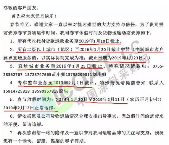物流公司發春節停運通知,最早1月10日停收,2019放假時間提前 年關將近,很多物流公司都陸續發布了2019年春節停運通知。 據了解,大部分物流公司從1月20日起開始放假,部分甚至在1月10日、12日就停止收貨,節后2月12日左右開始正常運輸。 2019年春節放假時間較2018年春節放假時間有所提前。 部分物流停運通知: