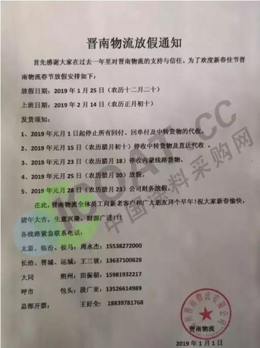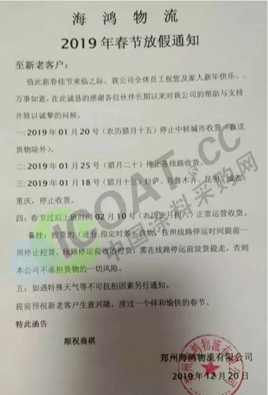 導語:年關將近,很多物流公司都陸續發布了2019年春節停運通知。大部分物流公司從1月20日起開始放假,部分甚至在1月10日、12日就停止收貨。有包裝廠也發出通知,春節將至,工廠放假,物流、運輸休息!要下單的老板們,抓緊啦!