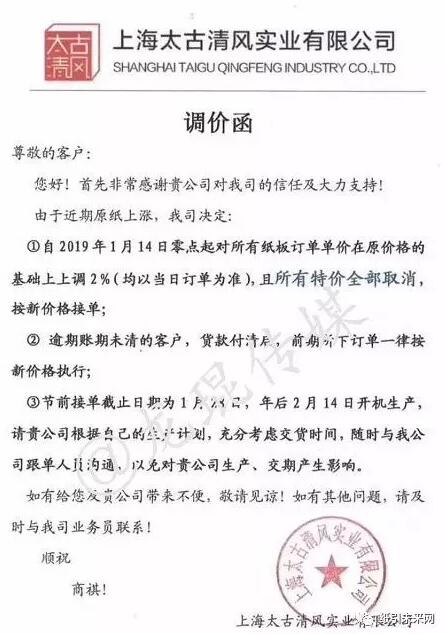 上海太古清風實業(yè)有限公司:自2019年1月14日零點起,所有紙板訂單單價在原價格的基礎上上調2%,且所有特價全部取消。節(jié)前接單截止日期為1月24日,年后2月14日開機生產。