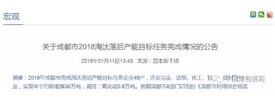 1月11日,四川省成都市經(jīng)濟(jì)和信息化委員會(huì)發(fā)布通知稱,2018年成都市完成淘汰落后產(chǎn)能目標(biāo)任務(wù)企業(yè)49戶,實(shí)現(xiàn)年節(jié)約標(biāo)準(zhǔn)煤36萬(wàn)噸,減排二氧化硫0.8萬(wàn)噸。
