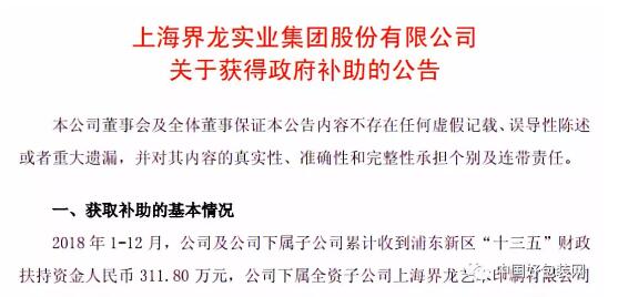又一包裝印刷企業獲得政府巨額補助!1月4日,界龍實業發布公告稱,2018年1-12月,公司及下屬子公司累計獲得政府補助1356.18萬元。