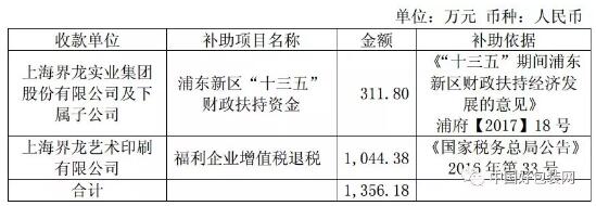 其中,界龍實業及下屬子公司累計收到浦東新區“十三五”財政扶持資金人民幣311.80萬元,其全資子公司上海界龍藝術印刷有限公司累計收到福利企業增值稅退稅人民幣1044.38萬元。