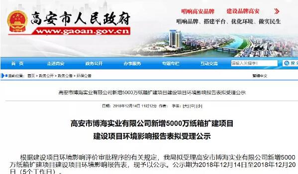 總投資1.5億,博海異地?cái)U(kuò)建 1月3日,高安市人民政府網(wǎng)站公示了《高安市博海實(shí)業(yè)有限公司新增5000萬(wàn)個(gè)紙箱擴(kuò)建項(xiàng)目建設(shè)項(xiàng)目環(huán)境影響報(bào)告表》。公告顯示,高安市博海實(shí)業(yè)有限公司現(xiàn)有廠區(qū)項(xiàng)目分兩期獲得批復(fù),一期項(xiàng)目于2009年6月12日批復(fù),二期項(xiàng)目于2017年10月9日批復(fù),合計(jì)產(chǎn)能為1.8萬(wàn)噸(折合7500萬(wàn)個(gè)/年)。 而“新增5000萬(wàn)個(gè)紙箱擴(kuò)建項(xiàng)目”屬于異地遷建、擴(kuò)建項(xiàng)目,位于江西省高安市八景工業(yè)園,總占地面積為56500.4平方米,總建筑面積為45268.31平方米。 該擴(kuò)建項(xiàng)目總投資為15000萬(wàn),其中環(huán)保投資35萬(wàn),占總投資0.23%。目前經(jīng)過(guò)了高安市發(fā)改委同意,符合產(chǎn)業(yè)政策。 據(jù)悉,該項(xiàng)目主要建設(shè)內(nèi)容包括擬新建生產(chǎn)車間、辦公樓、職工宿舍、食堂、值班室(2個(gè))、倉(cāng)儲(chǔ)(原料車間、成品車間)、鍋爐房(一臺(tái)4t/h、一臺(tái)2t/h,燃料為天然氣,17萬(wàn)m3/a)、供水排水供電等工程。 項(xiàng)目以外購(gòu)原紙、玉米淀粉、燒堿、硼砂、水性油墨、活性炭等為原輔料,經(jīng)上紙、預(yù)熱、壓瓦楞、粘合(制膠)、烘干、切割、油墨經(jīng)印刷、切腳開(kāi)槽、打釘?shù)裙ば虻玫郊埾洌嫌?jì)總產(chǎn)能為12500萬(wàn)個(gè)紙箱/年。 擴(kuò)建的底氣何來(lái) 在市場(chǎng)整體低迷的情況下,博海敢于出其不意地斥資1.5億進(jìn)行大規(guī)模擴(kuò)張,對(duì)于這一家實(shí)力并不雄厚的企業(yè)來(lái)說(shuō),確實(shí)是有點(diǎn)令人不解。但博海的擴(kuò)張,也不是沒(méi)有來(lái)由的。 高安城區(qū)劃為縣級(jí)中心,博海包裝所在的八景工業(yè)園被劃到豐樟城鎮(zhèn)組群,《南昌大都市區(qū)規(guī)劃(2015-2030)》已完成成果編制!目前正在進(jìn)行公示!南昌大都市區(qū)包括南昌市域,撫州市的臨川區(qū)、東鄉(xiāng)縣,宜春市的高安市、豐城市、樟樹(shù)市、奉新縣、靖安縣,上饒市的余干縣和九江市的永修縣,總面積約2.3萬(wàn)平方公里。